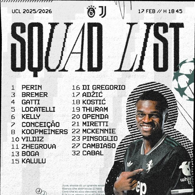北京时间2月16日,尤文官方公布欧冠淘汰赛附加赛首回合客战加拉塔萨雷的大名单,凯夫伦-图拉姆回归,戴维、霍尔姆缺阵。