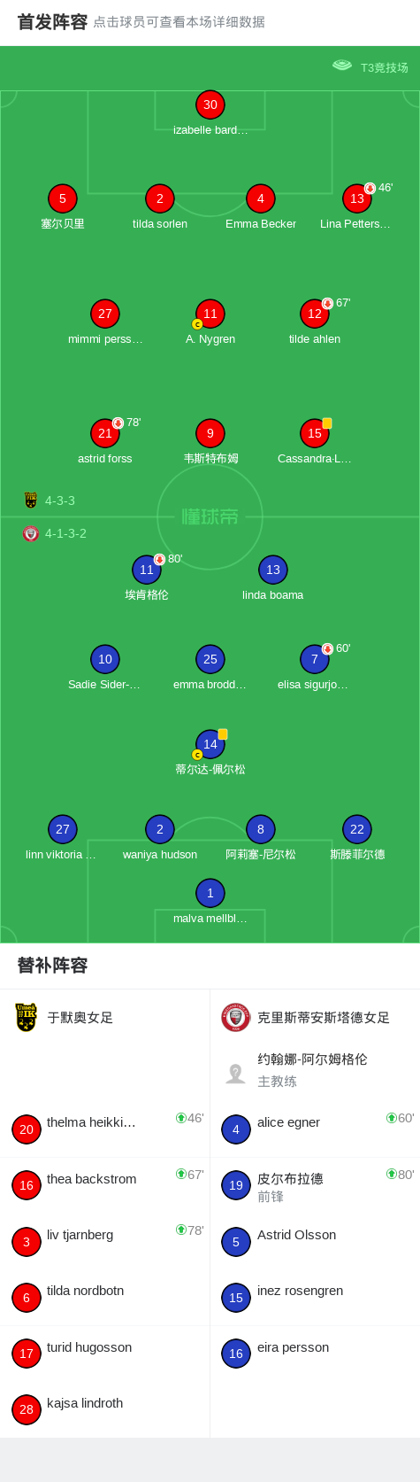 于默奥女足0-0克里斯蒂安斯塔德女足,双方破门乏术战报bot @懂球帝02-17 03:52北京时间2月17日女子足球瑞典杯 小组赛,于默奥女足对阵克里斯蒂安斯塔德女足。最终比分于默奥女足 0-0 克里斯蒂安斯塔德女足。点击查看本场比赛详细数据>> 球队阵容 展开更多