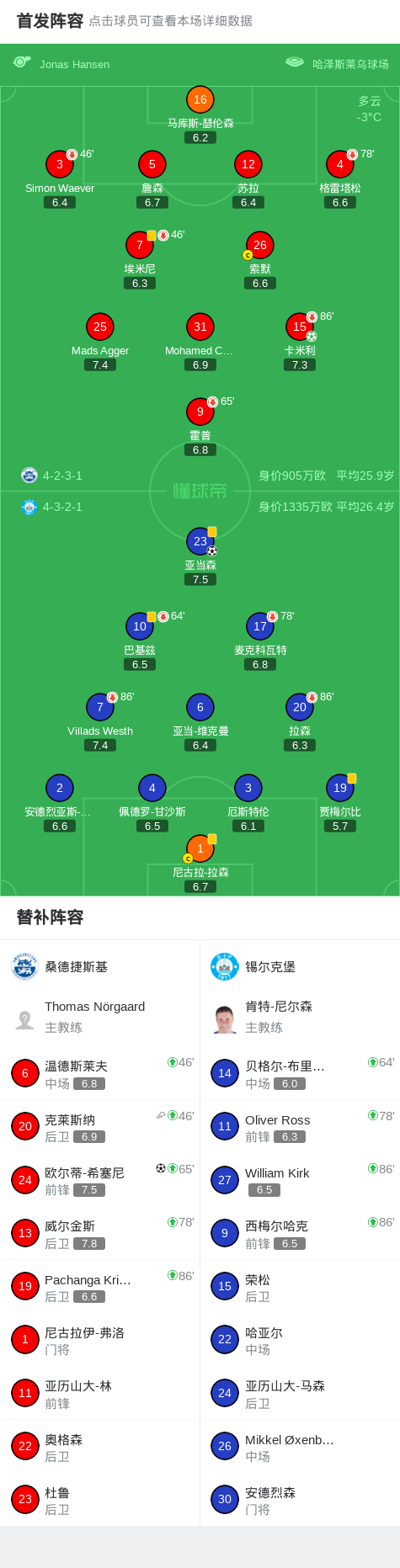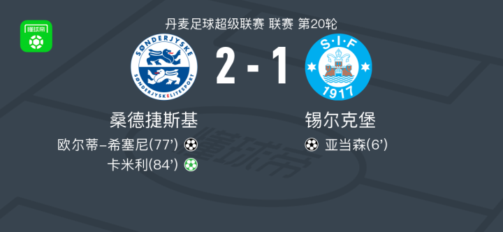 北京时间2月17日丹麦足球超级联赛 联赛 第20轮,桑德捷斯基主场对阵锡尔克堡。桑德捷斯基欧尔蒂-希塞尼破门,卡米利破门。锡尔克堡亚当森破门。最终比分桑德捷斯基 2-1 锡尔克堡。
