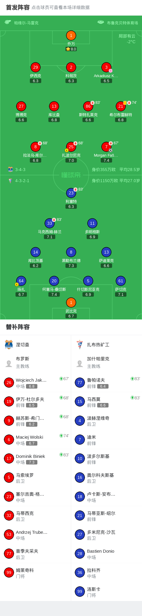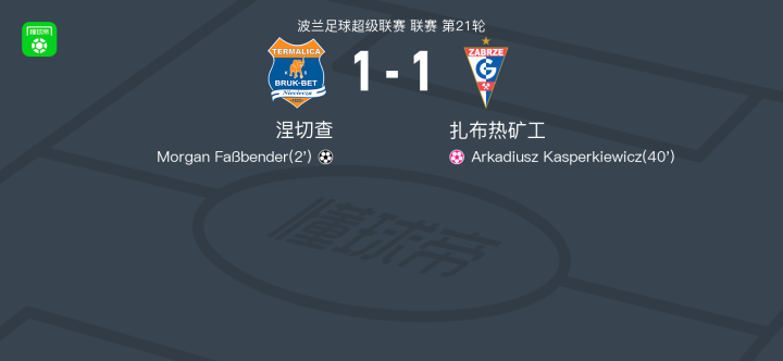 北京时间2月17日波兰足球超级联赛 联赛 第21轮,涅切查主场对阵扎布热矿工。涅切查Morgan Faßbender破门,Arkadiusz Kasperkiewicz自摆乌龙。最终比分涅切查 1-1 扎布热矿工。