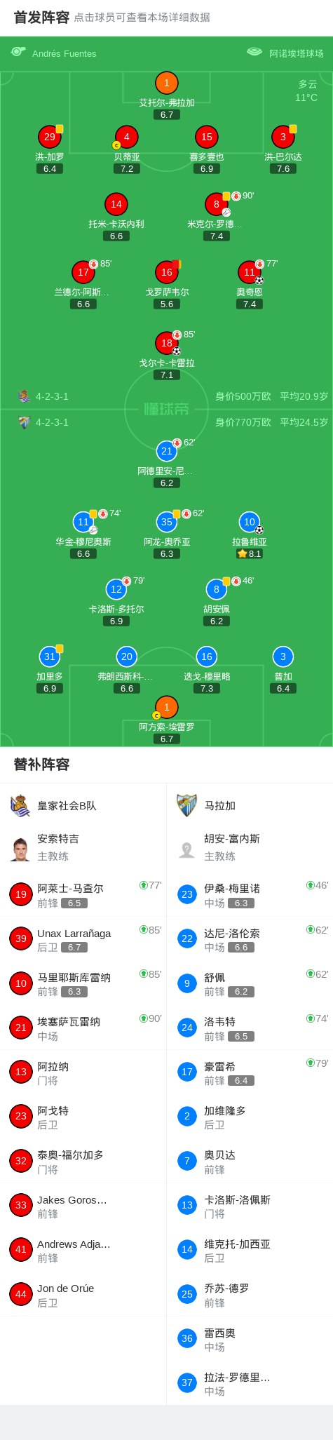 第72分钟,皇家社会B队球队戈罗萨韦尔吃到第二张黄牌。