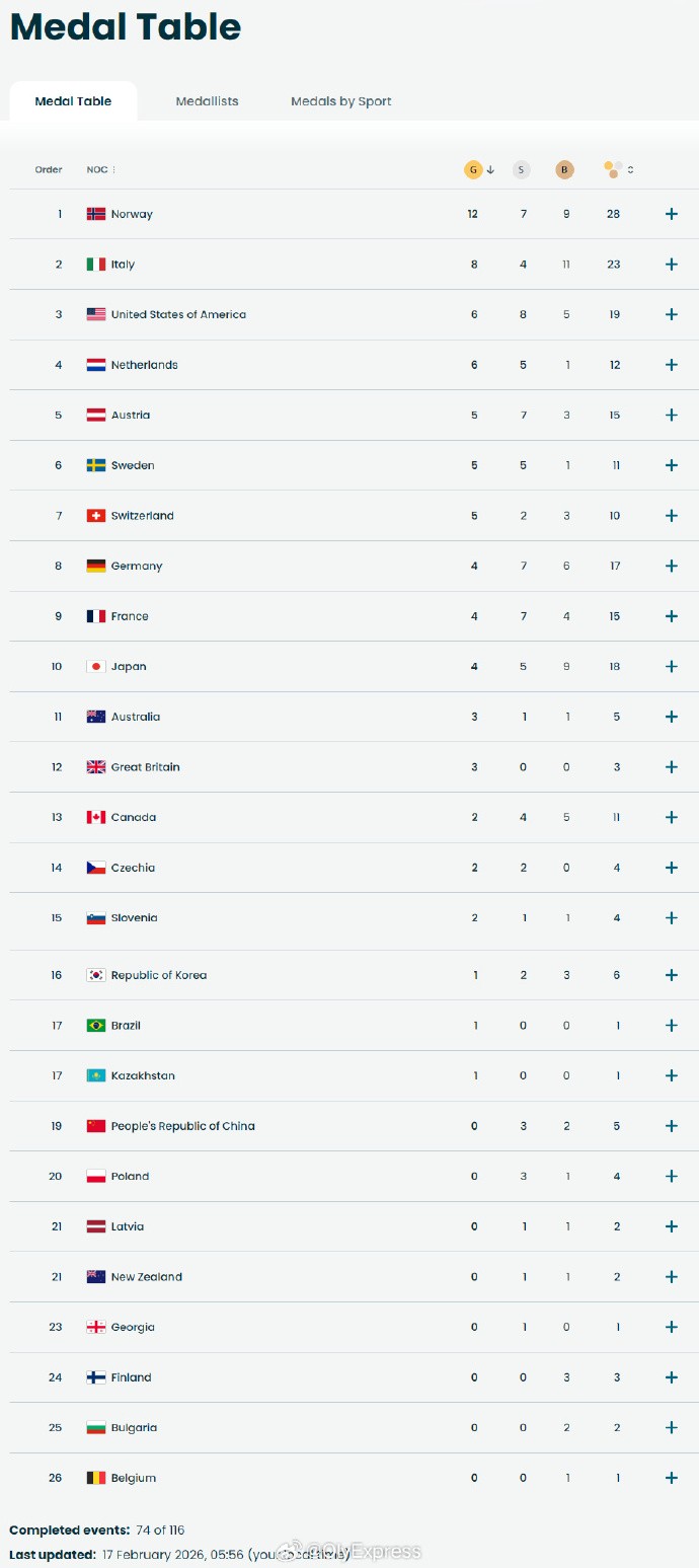 北京时间2月16日,冬奥会第十比赛日结束,116枚金牌已经产生74枚。挪威以12金7银9铜继续高居榜首,东道主意大利8金仍然排名次席,美国和荷兰各6金,中国队3银2铜仍然位列第19位。