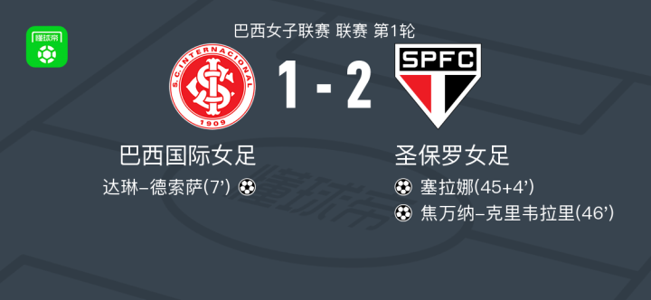 北京时间2月17日巴西女子联赛 联赛 第1轮,巴西国际女足主场对阵圣保罗女足。巴西国际女足达琳-德索萨破门。圣保罗女足塞拉娜破门,焦万纳-克里韦拉里破门。最终比分巴西国际女足 1-2 圣保罗女足。
