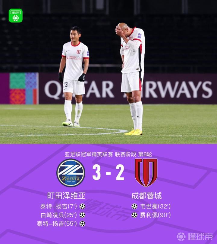 北京时间2月17日亚足联冠军精英联赛 联赛阶段 第8轮,町田泽维亚对阵成都蓉城。上半场席尔瓦传球失误,林幸多郎助攻泰特-扬吉门前轻松头球破门,之后白崎凌兵禁区外不停球轰出世界波扩大比分,随后町田门将守田达弥停球失误,韦世豪将球铲进球门扳回一球。下半场桑山侃士传中,泰特-扬吉完成头球梅开二度,比赛尾声廖荣祥传中,费利佩头球破门扳回一球。最终成都蓉城2-3不敌町田泽维亚无缘出线。
