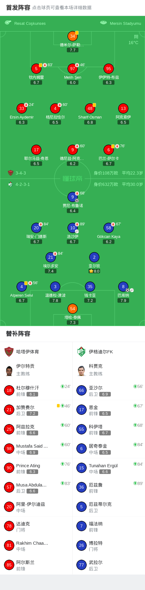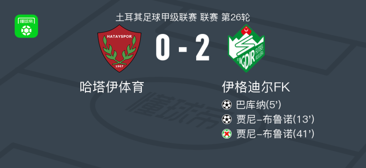北京时间2月17日土耳其足球甲级联赛 联赛 第26轮,哈塔伊体育主场对阵伊格迪尔FK。伊格迪尔FK巴库纳破门,贾尼-布鲁诺破门。最终比分哈塔伊体育 0-2 伊格迪尔FK。