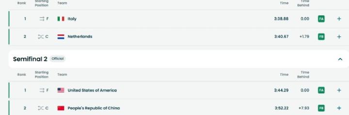 速度滑冰男团不敌美国队,将与荷兰队争夺铜牌gaoniu @懂球帝02-17 21:562月17日,米兰冬奥会速度滑冰男子团体追逐半决赛,刘瀚彬、宁忠岩、吴宇联手出战,成绩为3:52.22,尽管无缘晋级A组决赛,中国队已经创造了历史最佳成绩,将在铜牌赛与荷兰队较量。意大利队以3分38秒88晋级A组决赛,荷兰队以3分40秒67晋级B组决赛。中国队以3分52秒22的成绩落后美国队7.93秒,晋级B组决赛,美国队成绩为3分44秒29。展开更多