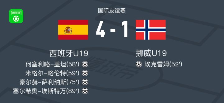 北京时间2月17日国际友谊赛,西班牙U19对阵挪威U19。西班牙U19何塞利略-盖坦破门,米格尔-略伦特破门,豪尔赫-萨利纳斯破门,塞尔希奥-埃斯特万破门。挪威U19埃克雷姆破门。最终比分西班牙U19 4-1 挪威U19。