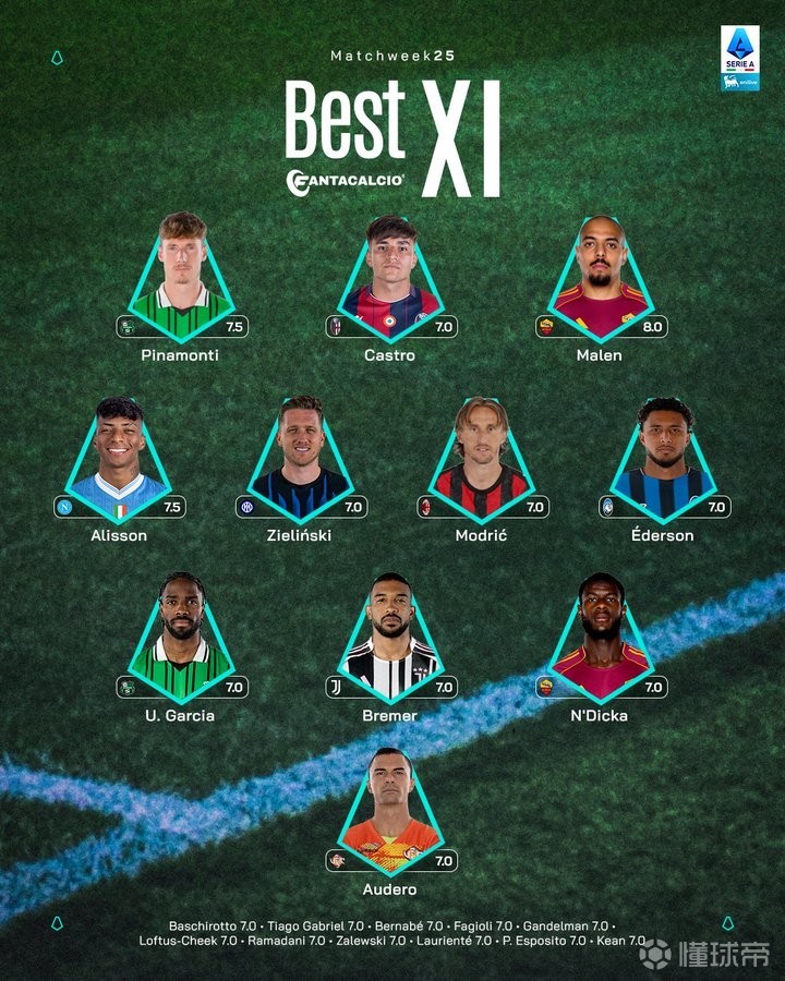 意甲官方公布了联赛第25轮的最佳阵容,莫德里奇、泽林斯基、布雷默、马伦在列。