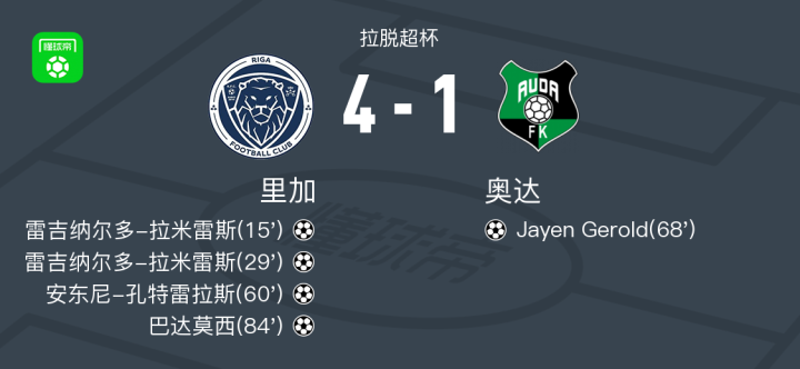 北京时间2月17日拉脱超杯,里加对阵奥达。里加雷吉纳尔多-拉米雷斯梅开二度,安东尼-孔特雷拉斯破门,巴达莫西破门。奥达Jayen Gerold破门。最终比分里加 4-1 奥达。