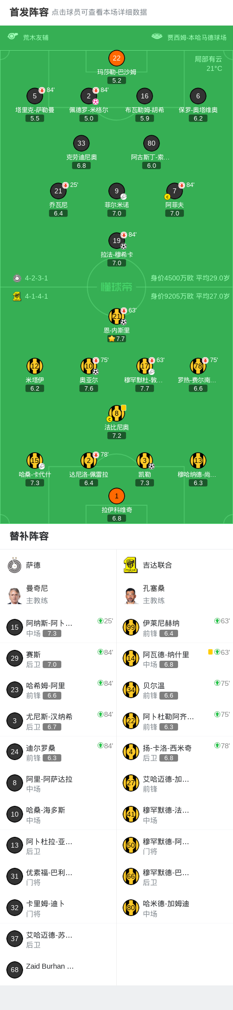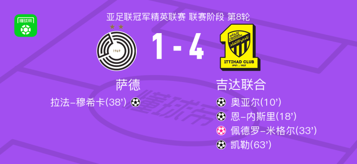 北京时间2月18日亚足联冠军精英联赛 联赛阶段 第8轮,萨德对阵吉达联合。萨德拉法-穆希卡破门,佩德罗-米格尔自摆乌龙。吉达联合奥亚尔破门,恩-内斯里破门,凯勒破门。最终比分萨德 1-4 吉达联合。