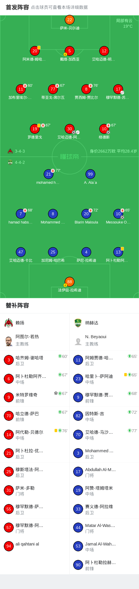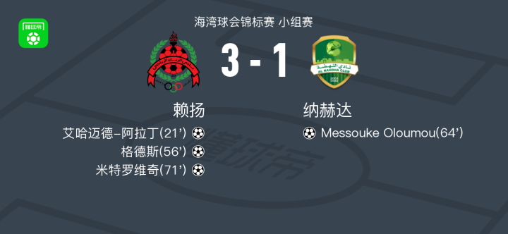 北京时间2月18日海湾球会锦标赛 小组赛,赖扬对阵纳赫达。赖扬艾哈迈德-阿拉丁破门,格德斯破门,米特罗维奇破门。纳赫达Messouke Oloumou破门。最终比分赖扬 3-1 纳赫达。
