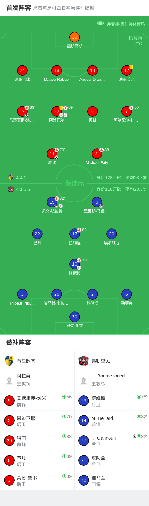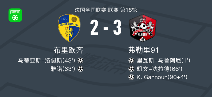 北京时间2月18日法国全国联赛 联赛 第18轮,布里欧齐主场对阵弗勒里91。布里欧齐马蒂亚斯-洛佩斯破门,雅诺破门。弗勒里91里瓦斯-马鲁阿尼破门,凯文-法拉德破门,K. Gannoun破门。最终比分布里欧齐 2-3 弗勒里91。