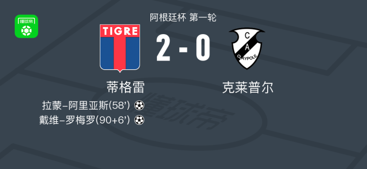 北京时间2月18日阿根廷杯 第一轮,蒂格雷对阵克莱普尔。蒂格雷拉蒙-阿里亚斯破门,戴维-罗梅罗破门。最终比分蒂格雷 2-0 克莱普尔。