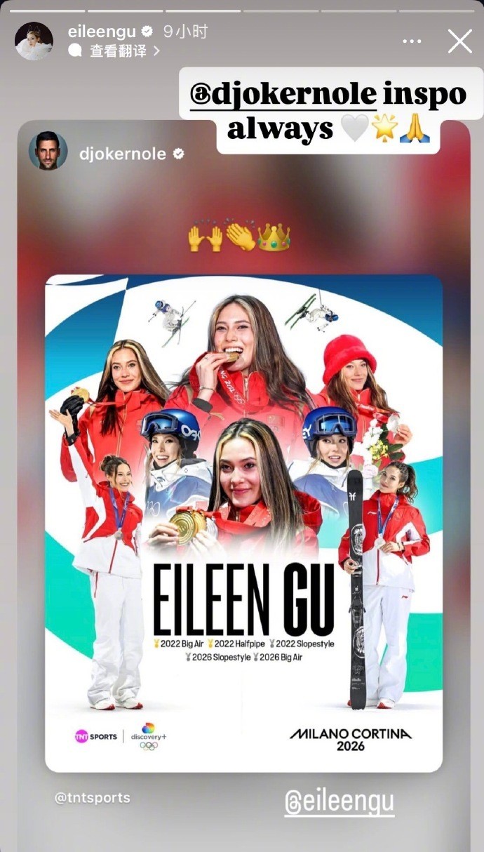 梦幻联动,德约科维奇祝贺谷爱凌奥运成就