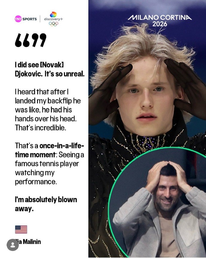 此外,德约科维奇在现场见证花滑名将马里宁做后空翻震惊到抱头的样子,也得到了马里宁本人的认证。