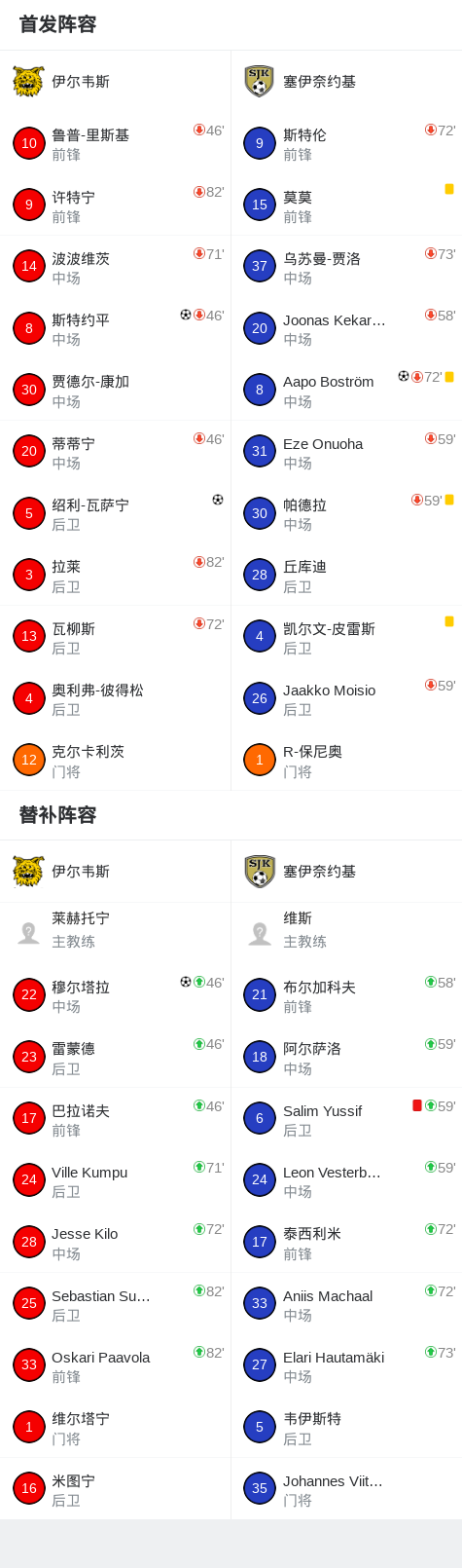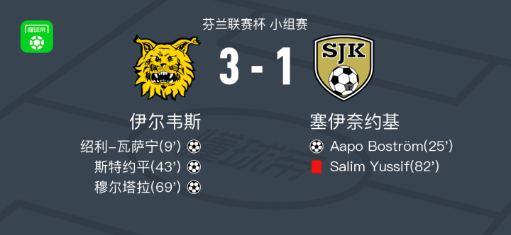北京时间2月18日芬兰联赛杯 小组赛,伊尔韦斯对阵塞伊奈约基。伊尔韦斯绍利-瓦萨宁破门,斯特约平破门,穆尔塔拉破门。塞伊奈约基Aapo Boström破门。最终比分伊尔韦斯 3-1 塞伊奈约基。