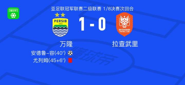 北京时间2月18日亚足联冠军联赛二级联赛 1/8决赛次回合,万隆对阵拉查武里。万隆安德鲁-容破门。最终比分万隆 1-0 拉查武里。两回合总比分万隆1-3拉查武里。