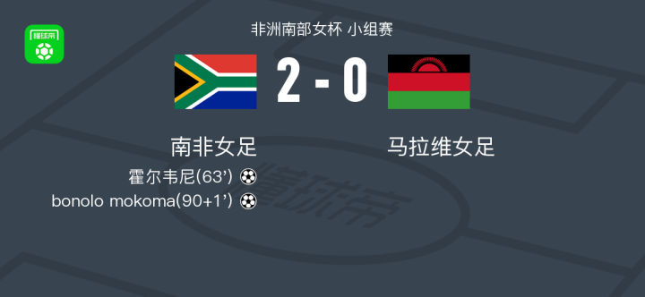 北京时间2月18日非洲南部女杯 小组赛,南非女足对阵马拉维女足。南非女足霍尔韦尼破门,bonolo mokoma破门。最终比分南非女足 2-0 马拉维女足。