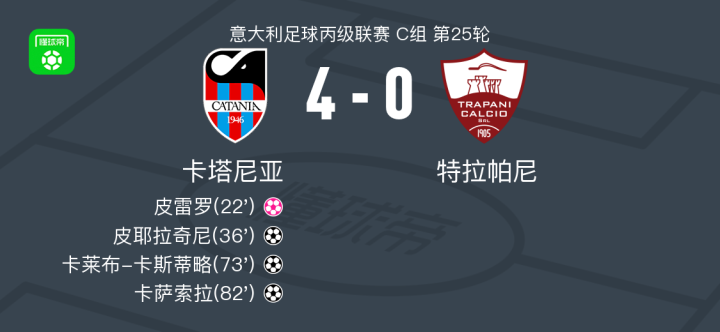 北京时间2月19日意大利足球丙级联赛 C组 第25轮,卡塔尼亚主场对阵特拉帕尼。卡塔尼亚皮耶拉奇尼破门,卡莱布-卡斯蒂略破门,卡萨索拉破门。特拉帕尼皮雷罗自摆乌龙。最终比分卡塔尼亚 4-0 特拉帕尼。