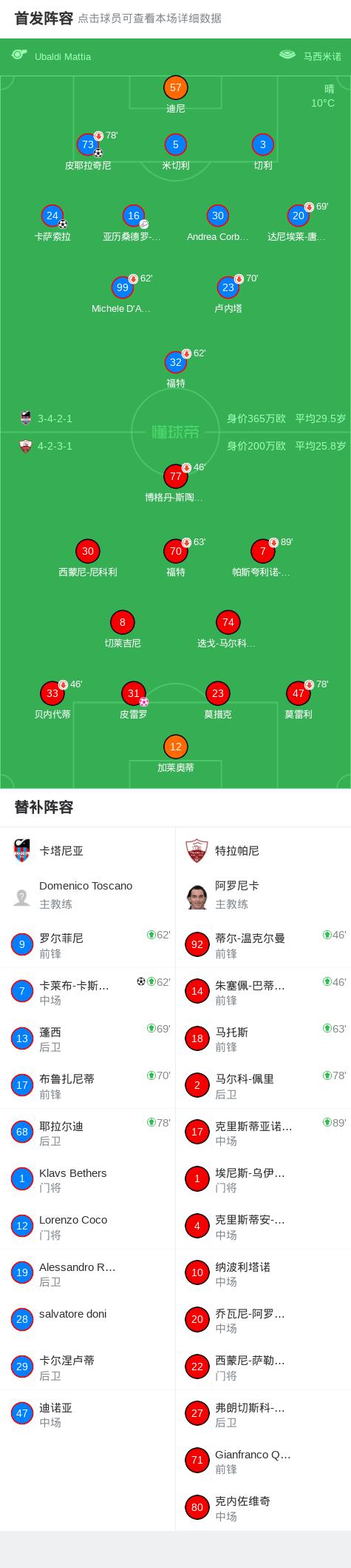 第36分钟,卡塔尼亚球员亚历桑德罗-夸伊尼助攻皮耶拉奇尼打入一球。