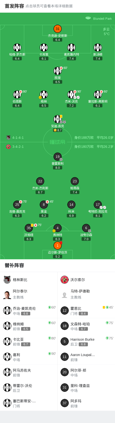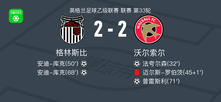 北京时间2月19日英格兰足球乙级联赛 联赛 第33轮,格林斯比主场对阵沃尔索尔。格林斯比安迪-库克梅开二度。沃尔索尔法夸尔森破门,普雷斯利破门。最终比分格林斯比 2-2 沃尔索尔。