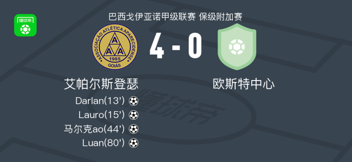 北京时间2月19日巴西戈伊亚诺甲级联赛 保级附加赛,艾帕尔斯登瑟主场对阵欧斯特中心。艾帕尔斯登瑟Darlan破门,Lauro破门,马尔克ao破门,Luan破门。最终比分艾帕尔斯登瑟 4-0 欧斯特中心。