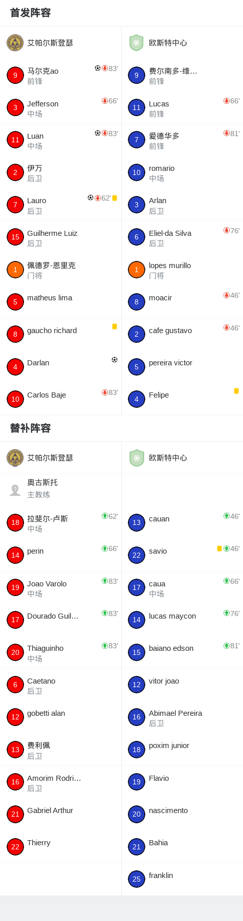 艾帕尔斯登瑟4-0大胜欧斯特中心,Luan、马尔克ao破门