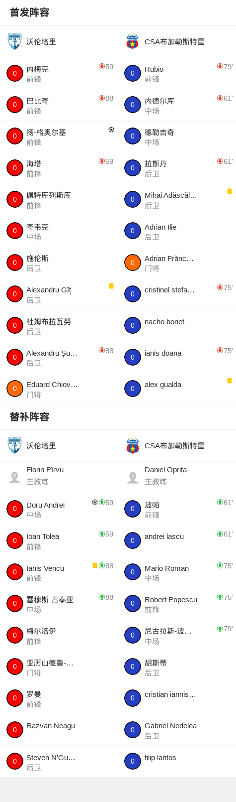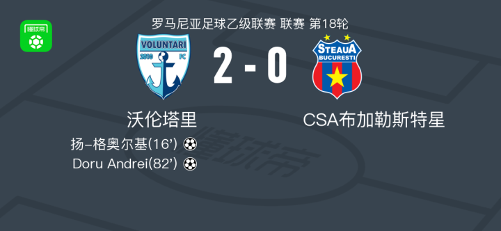 北京时间2月19日罗马尼亚足球乙级联赛 联赛 第18轮,沃伦塔里主场对阵CSA布加勒斯特星。沃伦塔里扬-格奥尔基破门,Doru Andrei破门。最终比分沃伦塔里 2-0 CSA布加勒斯特星。