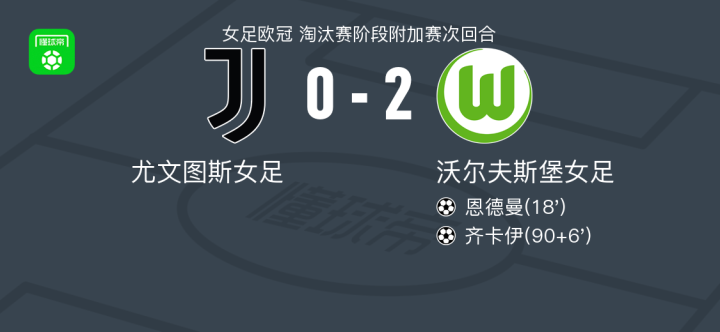 北京时间2月20日女足欧冠 淘汰赛阶段附加赛次回合,尤文图斯女足对阵沃尔夫斯堡女足。沃尔夫斯堡女足恩德曼破门,齐卡伊破门。最终比分尤文图斯女足 0-2 沃尔夫斯堡女足。两回合总比分尤文图斯女足2-4沃尔夫斯堡女足。