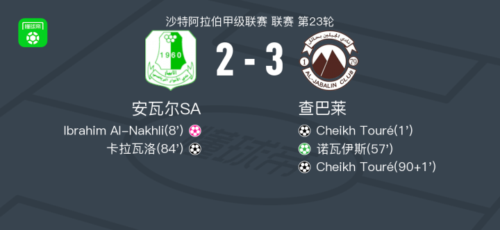 北京时间2月20日沙特阿拉伯甲级联赛 联赛 第23轮,安瓦尔SA主场对阵查巴莱。安瓦尔SA卡拉瓦洛破门。查巴莱Cheikh Touré梅开二度,诺瓦伊斯破门,Ibrahim Al-Nakhli自摆乌龙。最终比分安瓦尔SA 2-3 查巴莱。