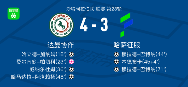 北京时间2月20日沙特阿拉伯联 联赛 第23轮,达曼协作主场对阵哈萨征服。达曼协作哈立德-加纳姆破门,威纳尔杜姆破门,哈马达拉-阿洛赖扬破门。哈萨征服穆拉德-巴特纳梅开二度,本德布卡破门,费尔南多-帕切科自摆乌龙。最终比分达曼协作 4-3 哈萨征服。