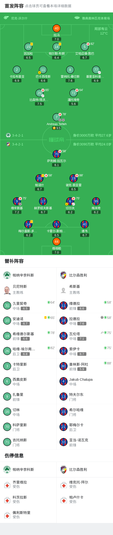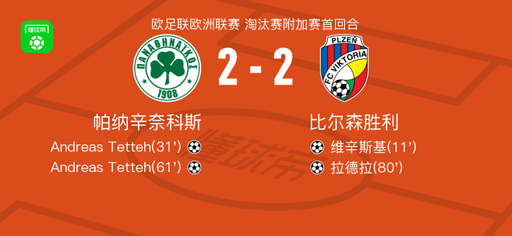 北京时间2月20日欧足联欧洲联赛 淘汰赛附加赛首回合,帕纳辛奈科斯对阵比尔森胜利。帕纳辛奈科斯Andreas Tetteh梅开二度。比尔森胜利维辛斯基破门,拉德拉破门。最终比分帕纳辛奈科斯 2-2 比尔森胜利。