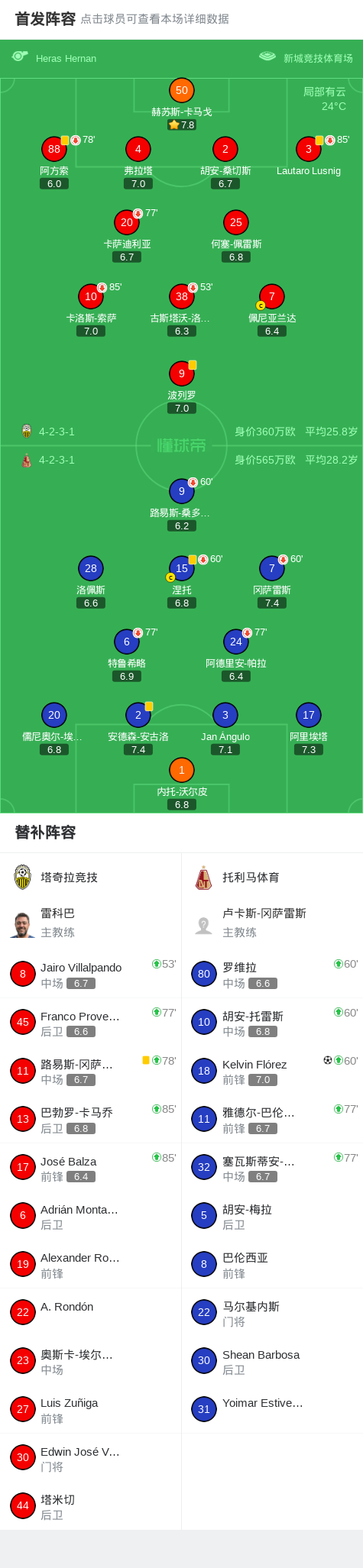 托利马体育1-0塔奇拉竞技,Kelvin Flórez一锤定音战报bot @懂球帝02-20 10:22北京时间2月20日南美解放者杯 资格赛第二轮,塔奇拉竞技对阵托利马体育。托利马体育Kelvin Flórez破门。最终比分塔奇拉竞技 0-1 托利马体育。点击查看本场比赛详细数据>>点击查看解放者杯完整积分榜>>精彩瞬间第65分钟,托利马体育球员Kelvin Flórez打入一球。 球队阵容 技术统计 展开更多