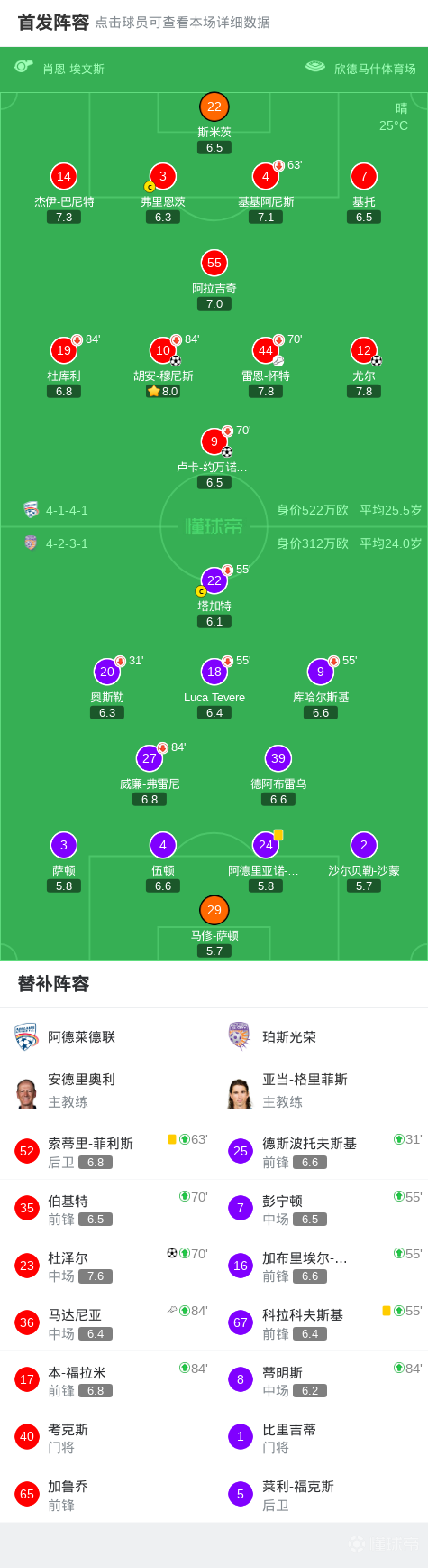 北京时间2月20日澳大利亚足球超级联赛第18轮,阿德莱德联主场对阵珀斯光荣。上半场胡安-穆尼斯任意球破门,之后约万诺维奇射门被萨顿挡出,尤尔补射破门。下半场怀特送助攻,约万诺维奇轻松破门,补时阶段杜泽尔过人后突入禁区破门。最终阿德莱德联4-0战胜珀斯光荣。