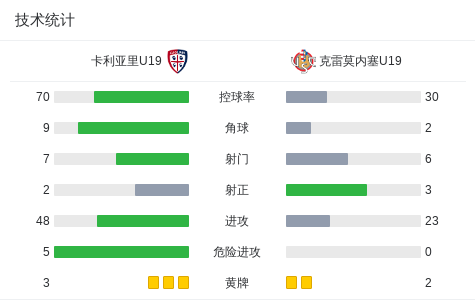 北京时间2月20日意大利青年联赛 联赛 第26轮,卡利亚里U19主场对阵克雷莫内塞U19。卡利亚里U19苏列夫破门。克雷莫内塞U19利库纳斯破门,Lorenzo Pio Marino破门。最终比分卡利亚里U19 1-2 克雷莫内塞U19。