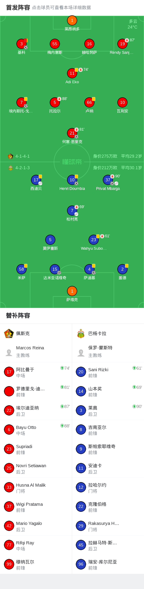北京时间2月20日印度尼西亚超级联赛 联赛 第22轮,佩斯克主场对阵巴杨卡拉。佩斯克基科破门,何塞-恩里克破门,埃内斯托-戈麦斯破门。巴杨卡拉达米亚诺维奇破门,萨迪基破门,Privat Mbarga破门,Henri Doumbia破门。最终比分佩斯克 3-4 巴杨卡拉。