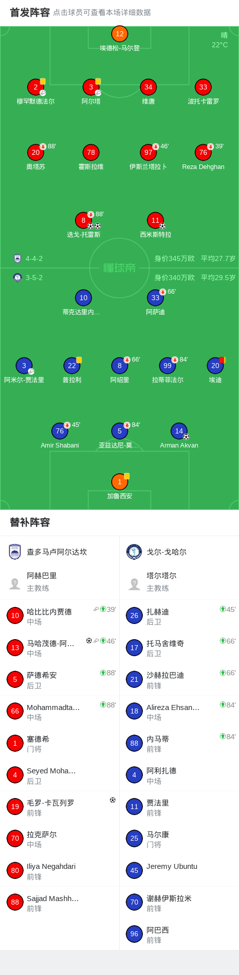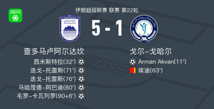 北京时间2月20日伊朗超级联赛 联赛 第22轮,查多马卢阿尔达坎主场对阵戈尔-戈哈尔。查多马卢阿尔达坎西米斯特拉破门,迭戈-托雷斯梅开二度,马哈茂德-阿巴迪破门,毛罗-卡瓦列罗破门。戈尔-戈哈尔Arman Akvan破门。最终比分查多马卢阿尔达坎 5-1 戈尔-戈哈尔。