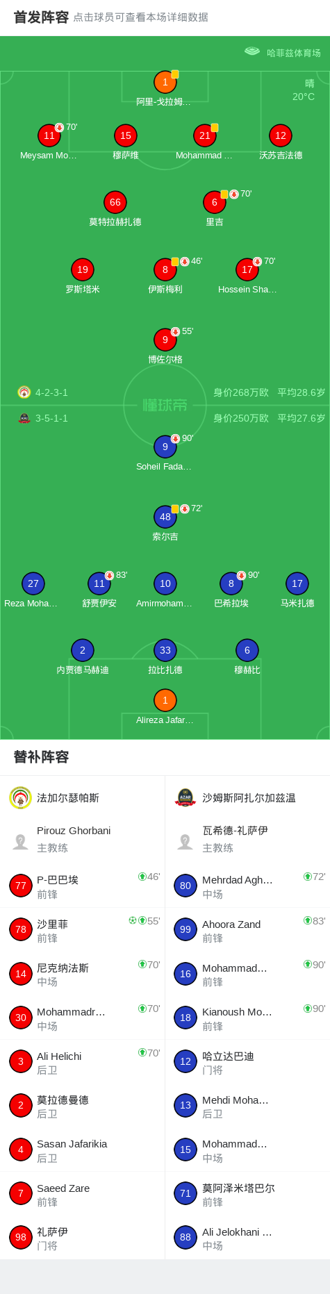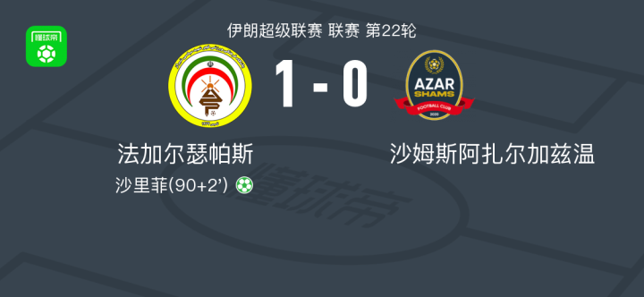 法加尔瑟帕斯1-0沙姆斯阿扎尔加兹温,沙里菲点射制胜战报bot @懂球帝02-21 01:17北京时间2月20日伊朗超级联赛 联赛 第22轮,法加尔瑟帕斯主场对阵沙姆斯阿扎尔加兹温。法加尔瑟帕斯沙里菲破门。最终比分法加尔瑟帕斯 1-0 沙姆斯阿扎尔加兹温。点击查看本场比赛详细数据>>点击查看伊朗超完整积分榜>>精彩瞬间下半场补时第2分钟,法加尔瑟帕斯球员沙里菲罚入点球。 球队阵容 展开更多