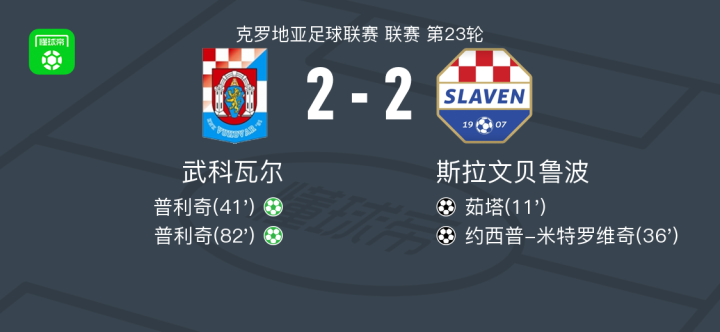北京时间2月21日克罗地亚足球联赛 联赛 第23轮,武科瓦尔主场对阵斯拉文贝鲁波。武科瓦尔普利奇梅开二度。斯拉文贝鲁波茹塔破门,约西普-米特罗维奇破门。最终比分武科瓦尔 2-2 斯拉文贝鲁波。