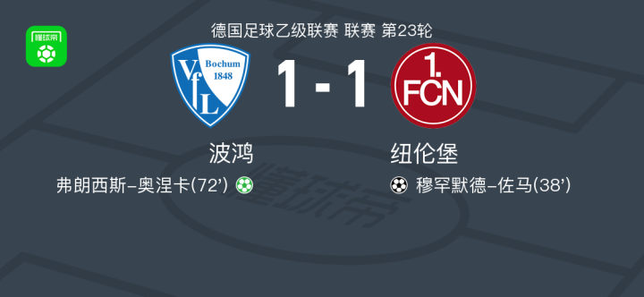 北京时间2月21日德国足球乙级联赛 联赛 第23轮,波鸿主场对阵纽伦堡。波鸿弗朗西斯-奥涅卡破门。纽伦堡穆罕默德-佐马破门。最终比分波鸿 1-1 纽伦堡。