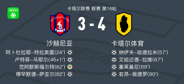 北京时间2月21日卡塔尔联赛 联赛 第16轮,沙赫尼亚主场对阵卡塔尔体育。沙赫尼亚阿卜杜拉耶-特拉奥雷破门,卢特菲-马耶尔破门,穆罕默德-萨亚尔破门。卡塔尔体育纳伊夫-哈德拉米破门,艾哈迈德-拉维破门,塞莱曼尼破门,若昂-佩德罗破门。最终比分沙赫尼亚 3-4 卡塔尔体育。