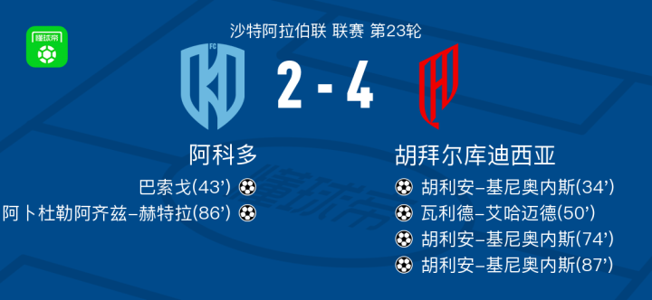 北京时间2月21日沙特阿拉伯联 联赛 第23轮,阿科多主场对阵胡拜尔库迪西亚。阿科多巴索戈破门,阿卜杜勒阿齐兹-赫特拉破门。胡拜尔库迪西亚胡利安-基尼奥内斯帽子戏法,瓦利德-艾哈迈德破门。最终比分阿科多 2-4 胡拜尔库迪西亚。
