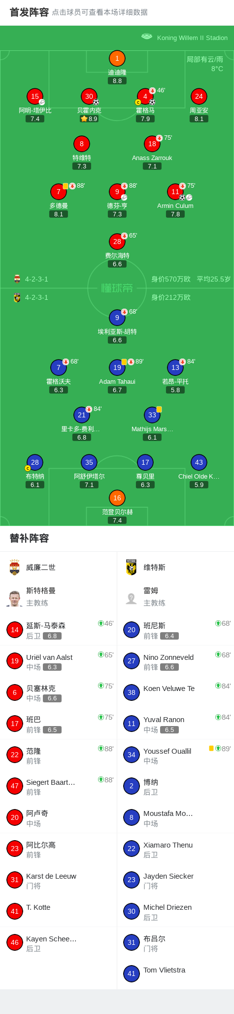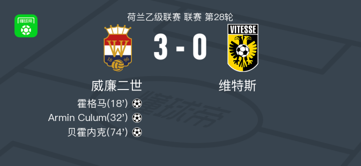 北京时间2月21日荷兰乙级联赛 联赛 第28轮,威廉二世主场对阵维特斯。威廉二世霍格马破门,Armin Culum破门,贝霍内克破门。最终比分威廉二世 3-0 维特斯。