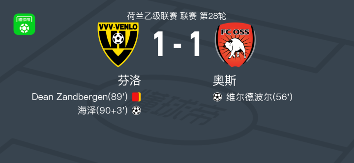 北京时间2月21日荷兰乙级联赛 联赛 第28轮,芬洛主场对阵奥斯。芬洛海泽破门。奥斯维尔德波尔破门。最终比分芬洛 1-1 奥斯。