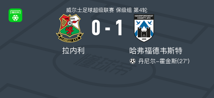 哈弗福德韦斯特1-0拉内利取威超4连胜,丹尼尔-霍金斯打进全场唯一进球战报bot @懂球帝02-21 05:36北京时间2月21日威尔士足球超级联赛 保级组 第4轮,拉内利主场对阵哈弗福德韦斯特。哈弗福德韦斯特丹尼尔-霍金斯破门。最终比分拉内利 0-1 哈弗福德韦斯特。点击查看本场比赛详细数据>>点击查看威超完整积分榜>>精彩瞬间第27分钟,哈弗福德韦斯特球员丹尼尔-霍金斯打入一球。 球队阵容 技术统计 展开更多