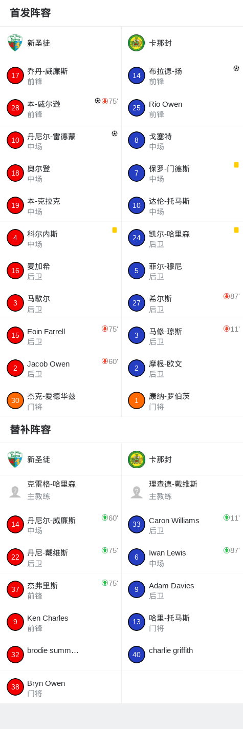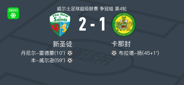 北京时间2月21日威尔士足球超级联赛 争冠组 第4轮,新圣徒主场对阵卡那封。新圣徒丹尼尔-雷德蒙破门,本-威尔逊破门。卡那封布拉德-扬破门。最终比分新圣徒 2-1 卡那封。