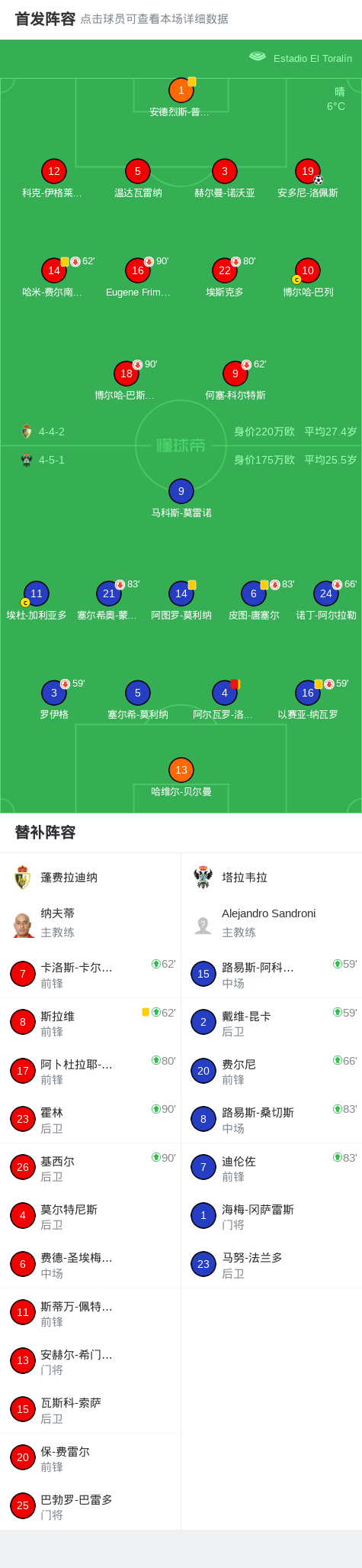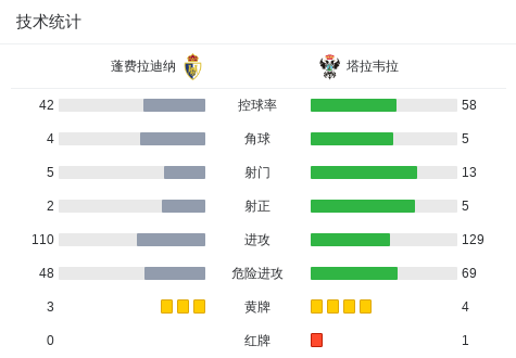 下半场补时第1分钟,塔拉韦拉球队阿尔瓦罗-洛佩斯吃到第二张黄牌。