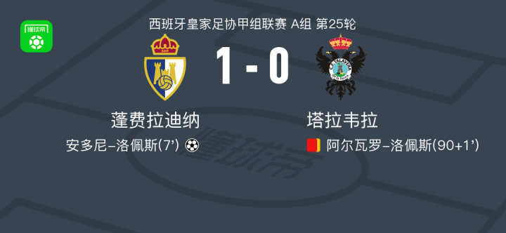 北京时间2月21日西班牙皇家足协甲组联赛 A组 第25轮,蓬费拉迪纳主场对阵塔拉韦拉。蓬费拉迪纳安多尼-洛佩斯破门。最终比分蓬费拉迪纳 1-0 塔拉韦拉。