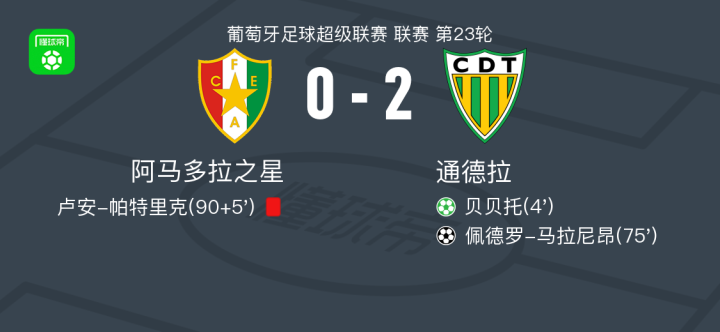 北京时间2月21日葡萄牙足球超级联赛 联赛 第23轮,阿马多拉之星主场对阵通德拉。通德拉贝贝托破门,佩德罗-马拉尼昂破门。最终比分阿马多拉之星 0-2 通德拉。