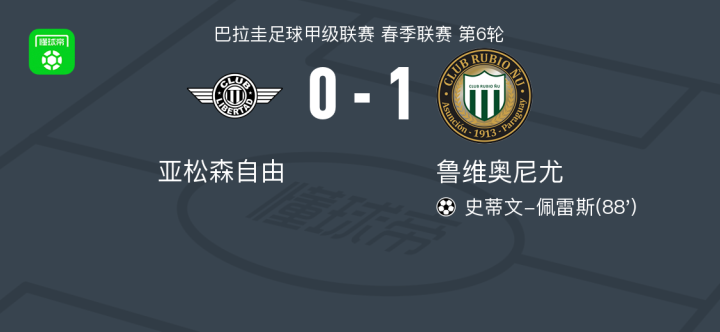 北京时间2月21日巴拉圭足球甲级联赛 春季联赛 第6轮,亚松森自由主场对阵鲁维奥尼尤。鲁维奥尼尤史蒂文-佩雷斯破门。最终比分亚松森自由 0-1 鲁维奥尼尤。